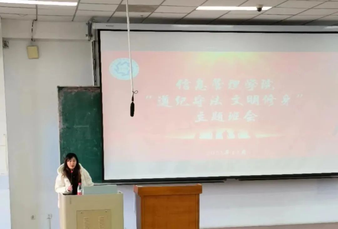 为倡导“遵纪守法 文明修身”的理念,严肃校园纪律,促进校园文明建设,强化同学们的遵纪守法意识和文明素养,华体会登陆入口于12月11日至12月17日开展“遵纪守法 文明修身”主题班会,华体会登陆入口党委副书记赵丽明同各年级辅导员深入班级,带领同学们一起学习纪律规范,提升文明素养。本次“遵纪守法 文明修身”主题班会既是一次深入的思想教育,同时也是对《黑龙江大学学生管理规定》(2023年9月修订)一次深入的学习。信管学子们通过本次主题班会,更加坚持贯彻“遵纪守法 文明修身”的理念,以高尚的品格斩除万难,以良好的素质奋进新的未来。
